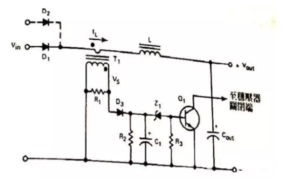 作業(yè)原理是:T1用來(lái)檢測(cè)負(fù)載電流IL,因此電阻R1會(huì)有成比例的電壓發(fā)生。D3為整流二極管,R3C1整流后的濾波電路,若電流過(guò)載發(fā)生時(shí),電容器C1上的電壓會(huì)添加到穩(wěn)壓二極管Z1的導(dǎo)通電壓,此刻三極管Q1會(huì)導(dǎo)通,因此Q1集電極上的信號(hào)可以封閉穩(wěn)壓器的驅(qū)動(dòng)信號(hào)。