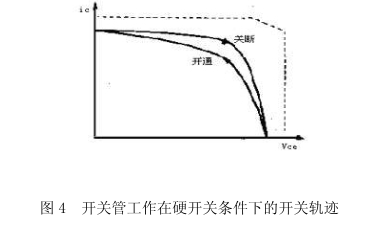 (d)二極管反向恢復問題:二極管由導通變?yōu)榻刂箷r存在著反向恢復期,在此期間內,二極管仍處于導通狀況,若當即注冊與其串聯(lián)的開關器件,簡單形成直流電源瞬間短路,產生很大的沖擊電流,輕則引起該開關器件和二極管耗急劇添加,重則致其損壞。圖4給出了接理性負載時,開關管作業(yè)在硬開關條件下的開關的開關軌跡,圖中虛線為雙極性晶體管的安全作業(yè)區(qū)(Safetyoperation area,SOA),假如不改善開關管的開關條件,其開關軌跡很可能會超出安全作業(yè)區(qū),導致開關管的損壞。