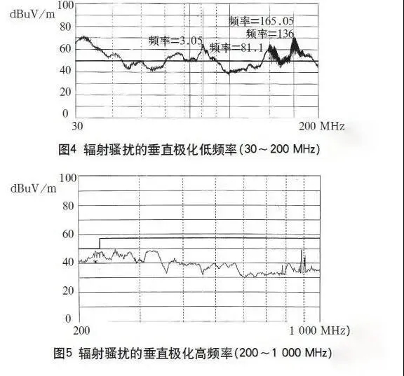 本開(kāi)關(guān)電源 經(jīng)過(guò)了傳導(dǎo)煩擾的檢驗(yàn),檢驗(yàn)波形如圖2、3所示。輻射煩擾高頻段230~1000MHz也檢驗(yàn)合格,如圖5所示。只是在30~200MHz頻段規(guī)模內(nèi)的垂直極化目標(biāo)超標(biāo), 超標(biāo)20dB,如圖4所示。
