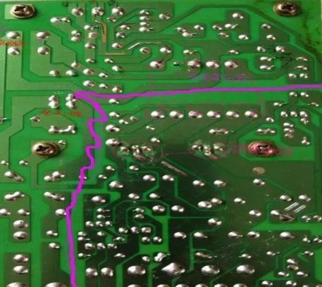 220V交流輸入,通過保險,負(fù)溫度熱敏電阻,安規(guī)電容,共模電感組成的抗電磁干擾電路及過流保護(hù)電路,通過整流二極管整流濾波后輸出300V左右的直流電壓。這是電源板正面圖,用紅線畫出的部分為熱地與冷地部分(開關(guān)電源接地方式有熱地和冷地之分,與220V電源直接相連的地稱為熱地,人體直接觸摸會觸電;經(jīng)開關(guān)變壓器阻隔后,再整流濾波后的地稱為冷地,人體直接觸摸不會觸電)。這是電路板反面圖,在圖中標(biāo)出開關(guān)電源的輸入部分、300V濾波大電容、開關(guān)管、開關(guān)變壓器、肖特基二極管等首要元器材。